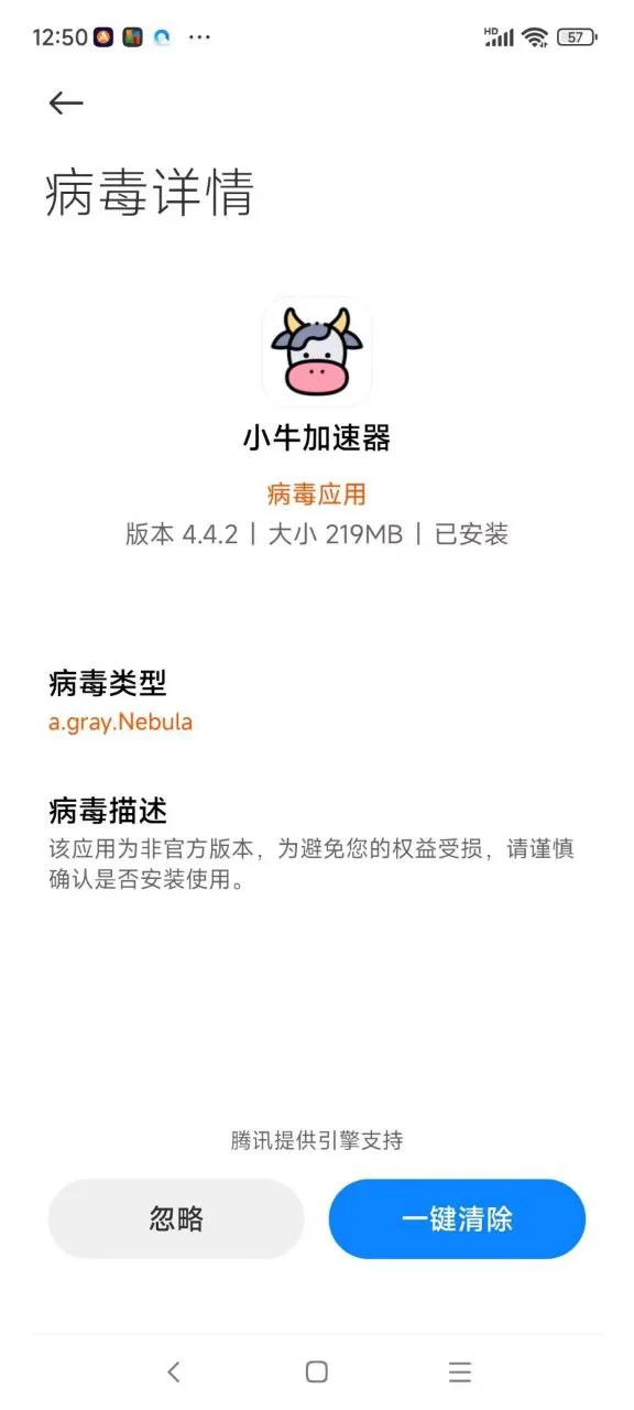 这个不是病毒,是一个风险提示。科学上网类的 app 都会被拉黑。您可以直接忽略。